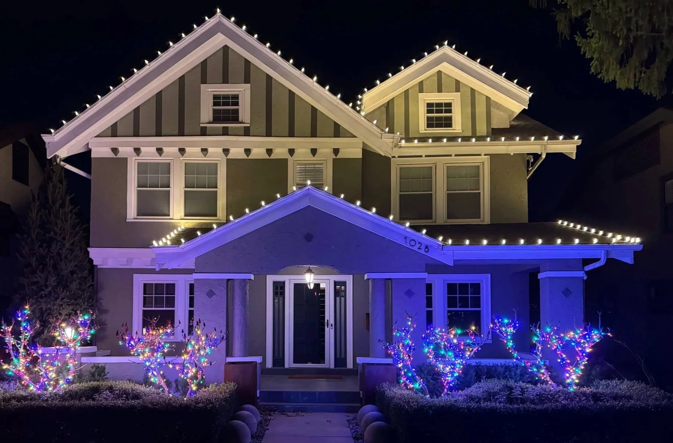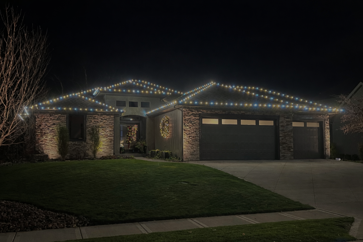 Warm White on Roof Line and Ridge Line Warm White and Red Alternating with Wreath Pure White and Red with Green Main Dormer Pure White, Green, and Red Alternating Multi Color Red and Green Pure White Warm White Champagne (Warm White and Pure White) Multi Color with Teal Green, Red, and Warm White Warm White with Mistletoe Peaks Warm White and Red Teal and Warm White Warm White with Multi Color Trees